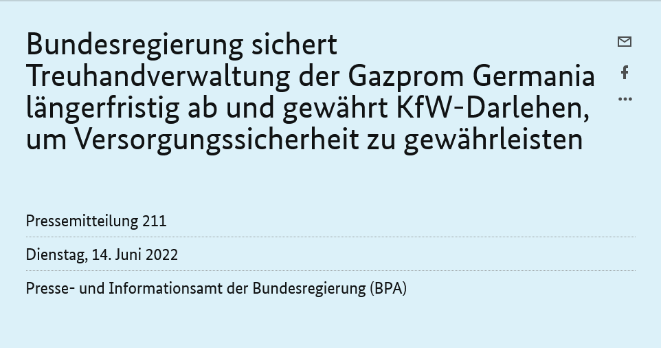 Ich halte dies – gelinde gesagt – für einen schlechten Witz. Das BMF hält Gazprom Germania also offensichtlich für bedingt abwicklungsbereit. Wäre Gazprom Germania abwicklungsfähig, nicht systemrelevant, hätte man es ohne derartige Verwerfungen in die Insolvenz entlassen können. Auf den Scheiterhaufen dysfunktionaler Unternehmen wie Greensill oder Wirecard; wo es hingehört. Stattdessen buttern wir Alle 9,8 Mrd. € an Krediten in ein Unternehmen, das nach wie vor russischen Oligarchen wenn nicht gar dem russischen Staat gehört.