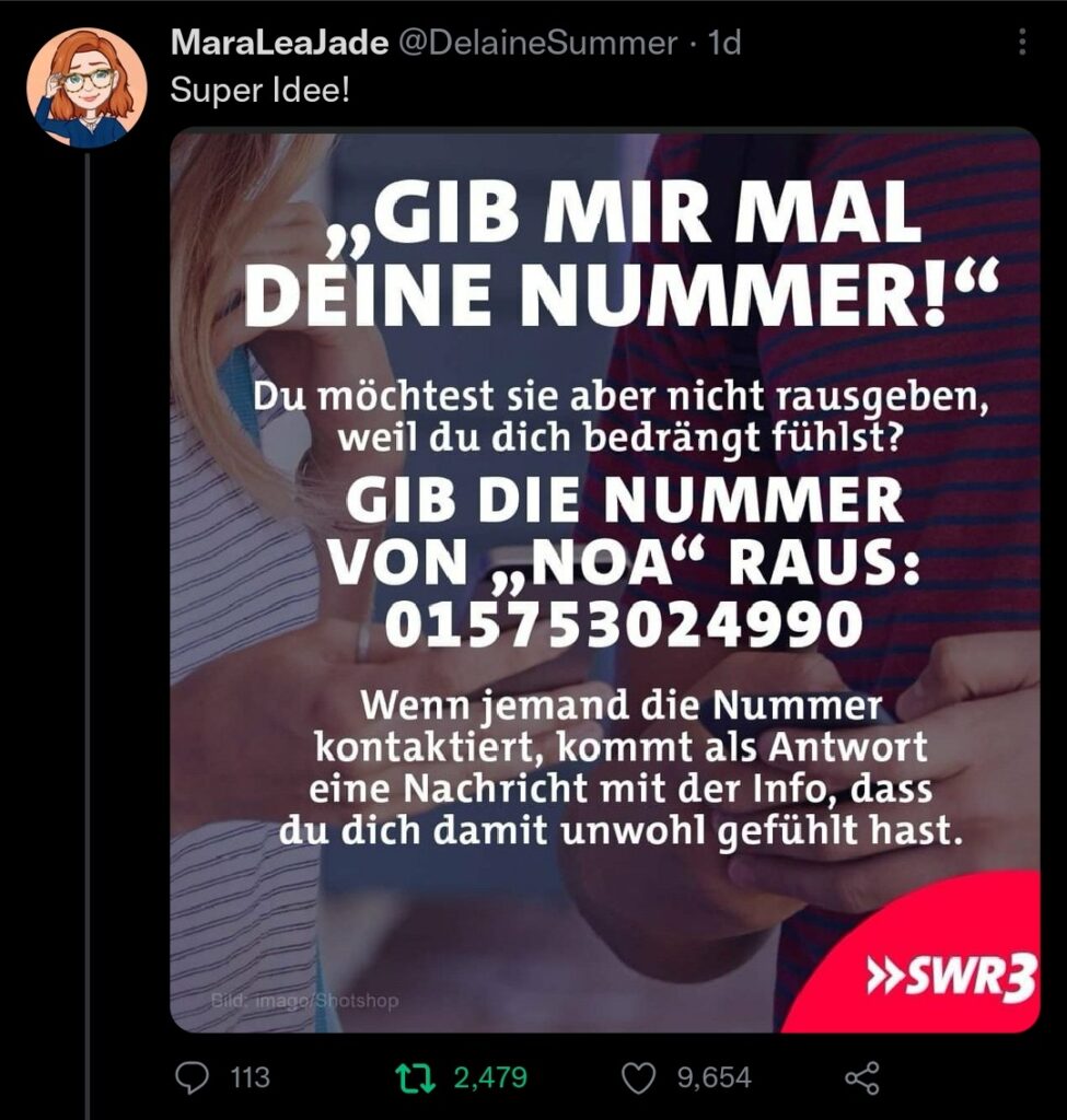 Falls du in eine solche Situation geraten solltest und deinem Gegenüber – warum auch immer – nicht direkt sagen möchtest, dass du kein Interesse hast, kannst du Noas Nummer nennen; die 015753024990.