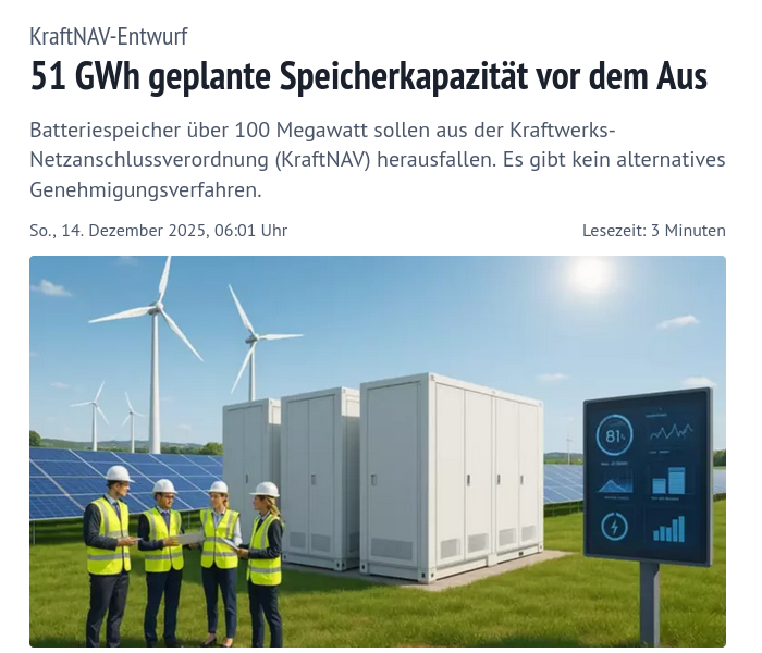 1. […] Durch einen einzigen Satz stoppte Katharina Reiche den für die Energiewende eigentlich notwendigen … Ohne Regelung für den Netzanschluss keine neuen Batteriespeicher. Anstelle des fairen Windhundprinzips treten Mafiamethoden. Dass sich diese auch noch das Oligopol der Übertragungsnetzbetreiber (ÜNBs) aus Tennet, Amprion, 50 Hertz und TransnetBW selbst geben durfte, ist nur ein weiterer Aspekt dieses Skandals. […]